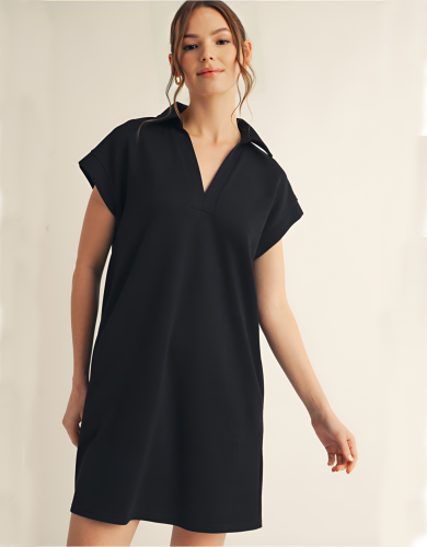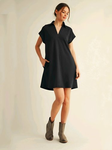 Gömlek Yaka Cepli Süprem Penye Elbise -Siyah