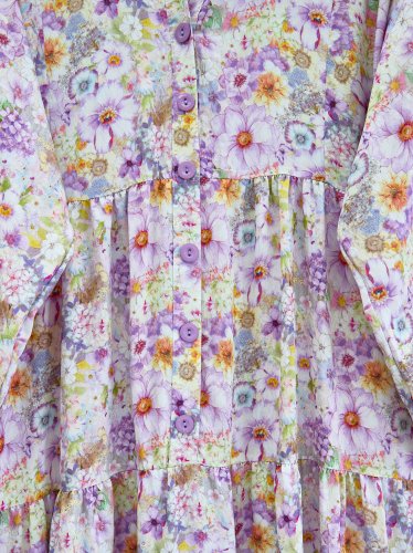 Yarım Düğmeli Kolu Lastikli Çiçek desenli Elbise -Lila