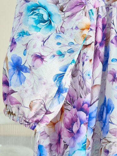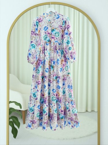Karışık Çiçek Baskılı Yarım Düğmeli Parçalı Elbise -Mavi