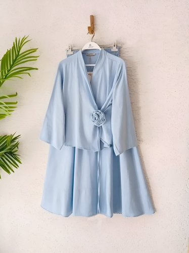 Gül Broşlu Yandan Bağlamalı Ceket Etek Keten Takım -Bebe Mavi