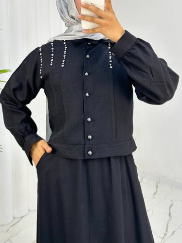 Omuzu Taşlı Düğmeli Ceket Etek Keten Takım -Siyah