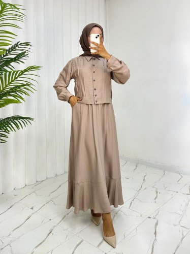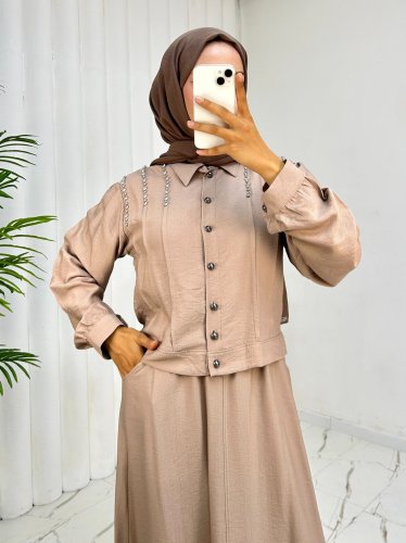 Omuzu Taşlı Düğmeli Ceket Etek Keten Takım -Vizon