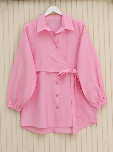 Çapraz Bağlamalı Kolu Lastikli Düğmeli Gömlek -Pembe