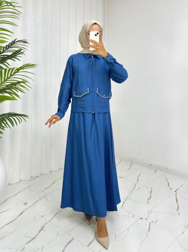 Fermuarlı Ceketli Beli Lastikli Etekli Keten Takım -Mavi