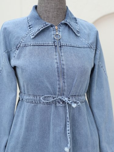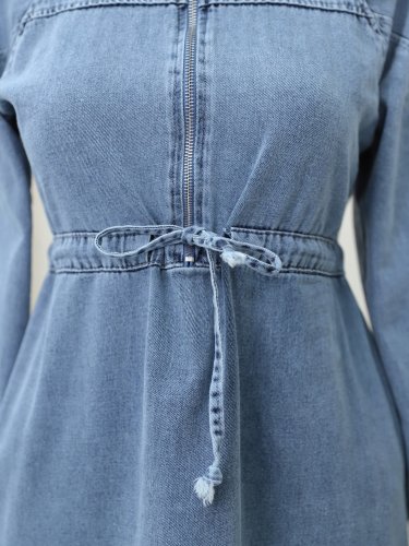 Yarım Fermuarlı Tünel Bağcıklı Kot Elbise -Buz Mavi