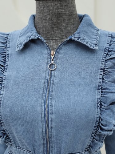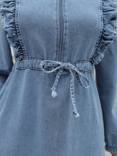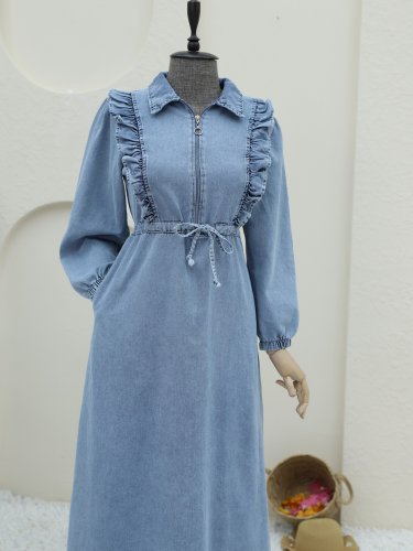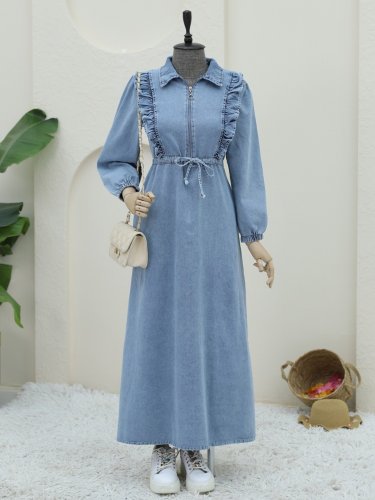 Yarım Fermuarlı Tünel Bağcıklı Kot Elbise -Buz Mavi
