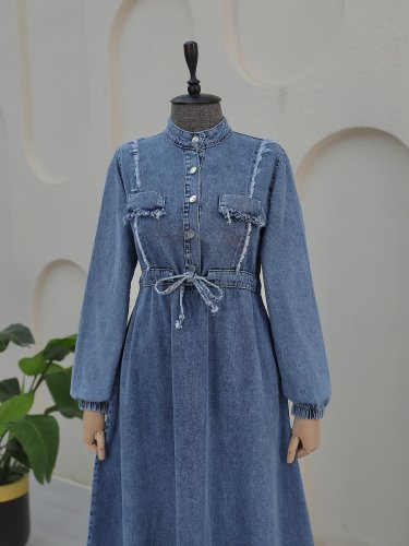 Eteği Püsküllü Tünel Bağcıklı Kot Elbise -Buz Mavi