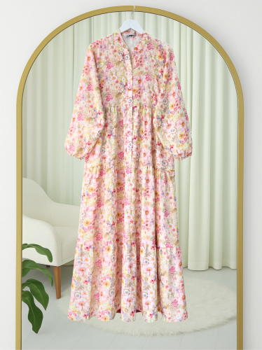 Yarım Düğmeli Kolu Lastikli Çiçek desenli Elbise -Pudra