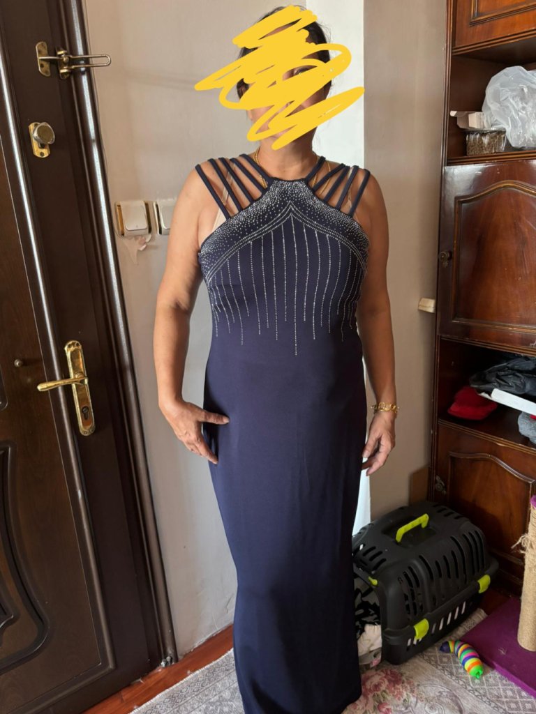 Kadın omuz çoklu askılı önü taş işlemeli balık kesim janjan krep maxi boy elbise