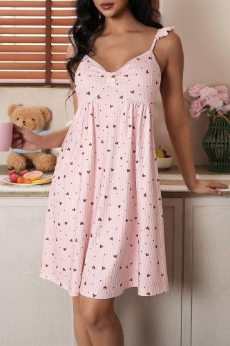 Pembe Sevimli Kalp Desenli Volan Askılı A Kesim Gecelik 15961