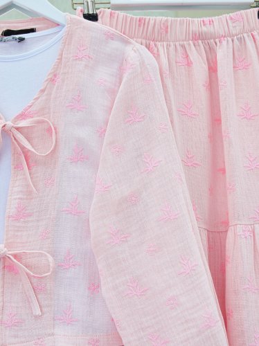 Önü Bağcıklı Nakış Detaylı Etekli Müslin Takım -Pudra