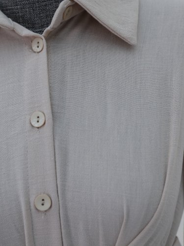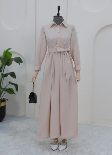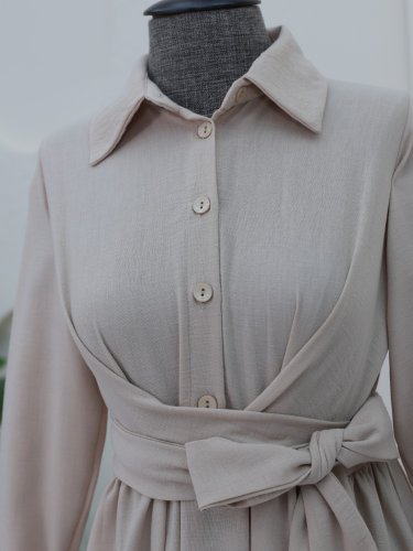 Yarım Düğmeli Önü Çapraz Bağlamalı Keten Elbise -Bej