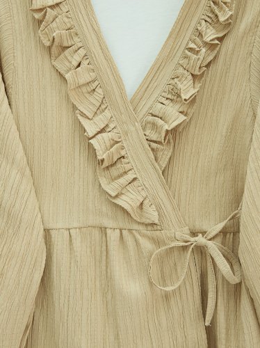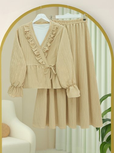 Yakası Fırfırlı Önü Bağlamalı Etekli Kimono Takım -Açık Vizon
