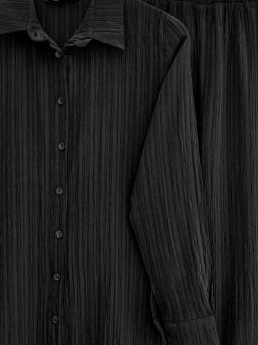 Düğmeli Uzun Pantolonlu Krinkıl Takım -Siyah