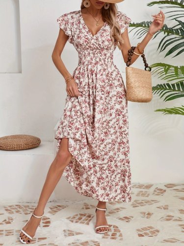 Kadın kısa kollu kruvaze yaka beli lastikli çiçek desenli elbise