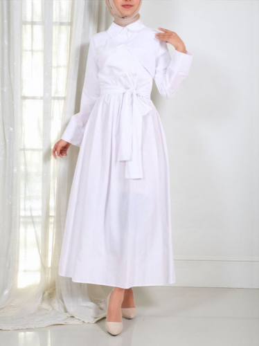 Çapraz Düğmeli Beli Bağlamalı Gömlek Yaka Elbise -Beyaz