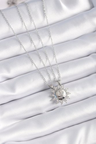 316L Çelik Gümüş Renk Zirkon Taşlı Güneş Model İşleme Yazı Detay Arkadaşlık Kolyesi