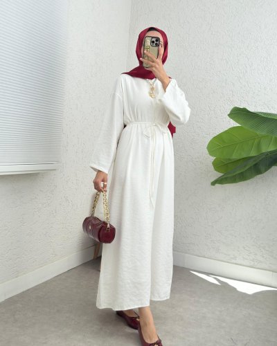 Beli Bağlamalı Arkası Fermuarlı Keten Elbise -Ekru