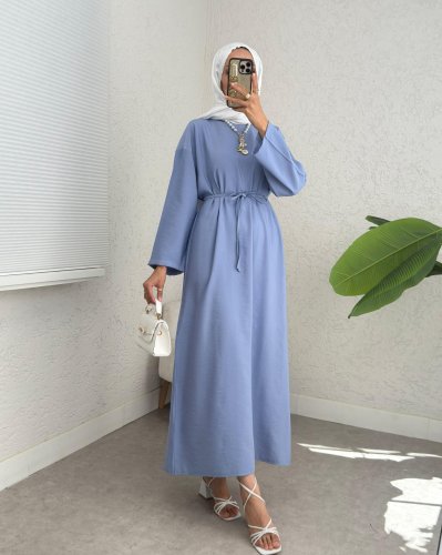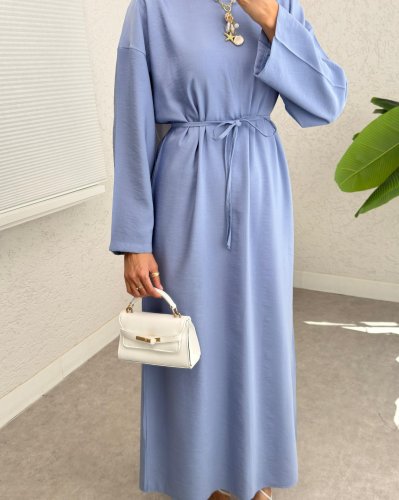 Beli Bağlamalı Arkası Fermuarlı Keten Elbise -Mavi