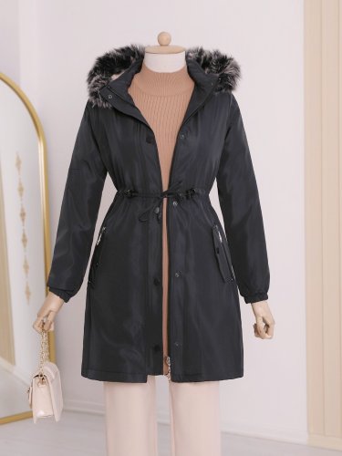 Çıkma Kapşonlu Kolu Lastikli Cepli Kısa Kaban -Siyah