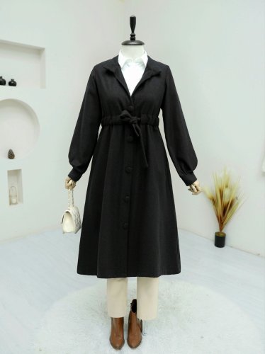 Hakim Yaka Tünel Bağcıklı Kaşe Kaban -Siyah