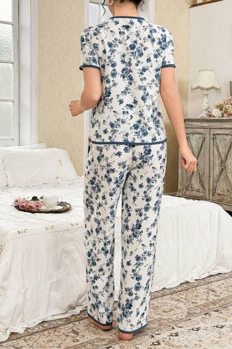 Mavi Çiçekli Düğme Detaylı Yazlık Pijama Takımı 7347
