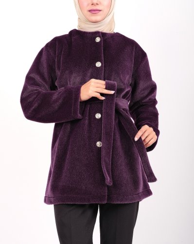 Düğmeli Beli Bağlamalı Kürklü Ceket -Mürdüm