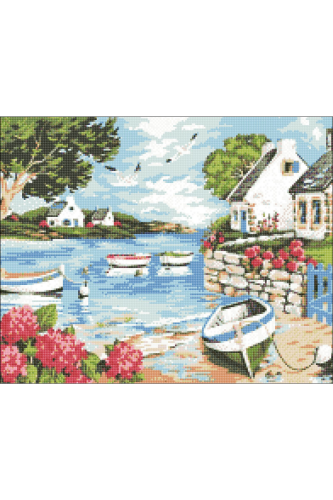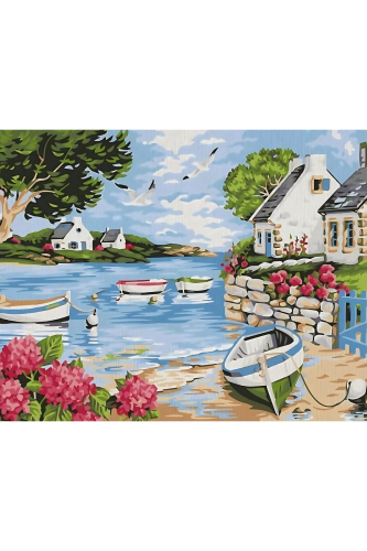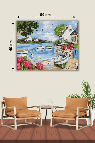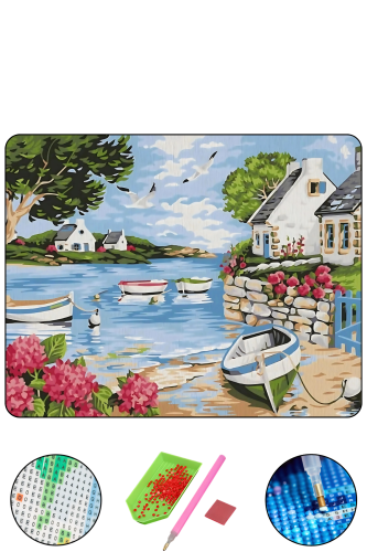 Denız kıyısında huzurlu köy Sayılarla Elmas Boyama Hobi Seti Tuvale Gerili