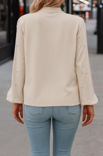 Kadın uzun kollu yakadan fiyonklu incili ithal krep bluz