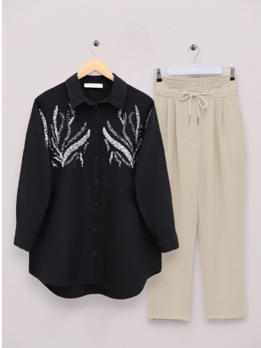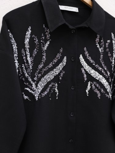 Önü Pul Payetli Uzun Gömlek -Siyah
