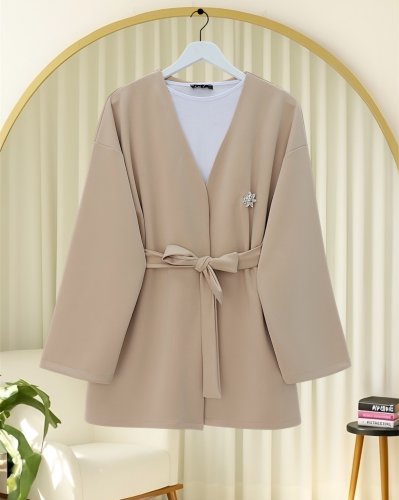 Broş Detaylı Beli Kuşaklı Scuba Ceket -Bej