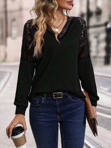 Kadın uzun kollu v yakalı dantelli waffle bluz