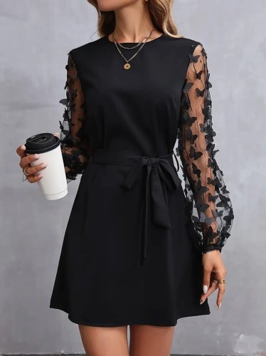 Kadın uzun kollu bisiklet yaka kollar tül kelebek detaylı ithal krep elbise
