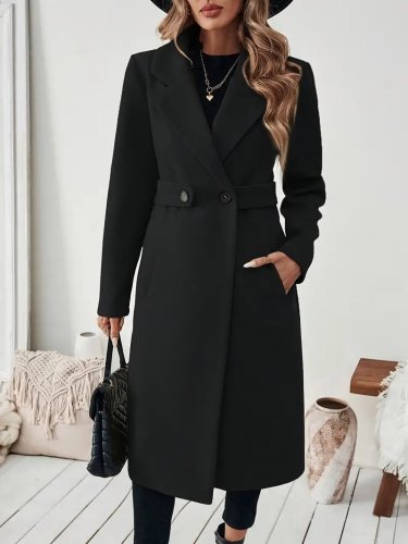 Kadın uzun kollu yakalı belde şerit düğme detaylı cepli mini kaşe kaban