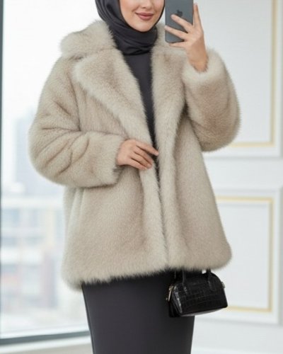 Kruvaze Saçaklı İçi Astarlı Tek Düğmeli Kürklü Kaban -Vizon