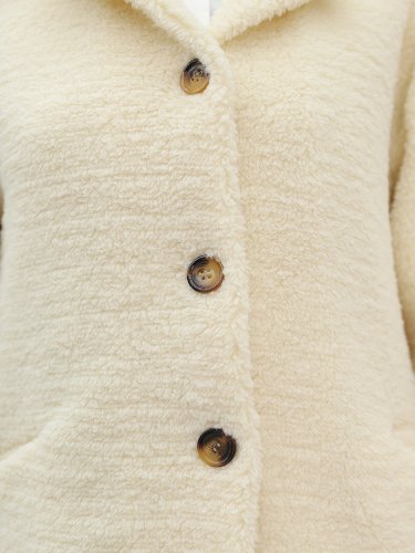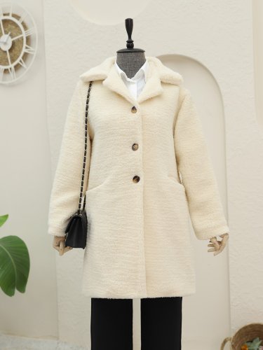 Düğmeli Astarlı Önden Cepli Peluş Kaban -Bej