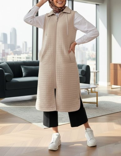 Fermuarlı Kapşonlu Cepli Uzun Kapitone Yelek -Taş