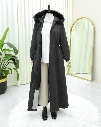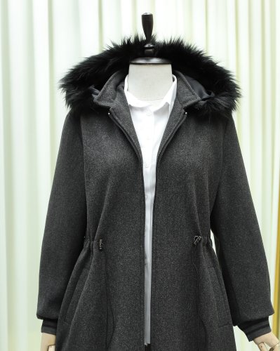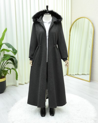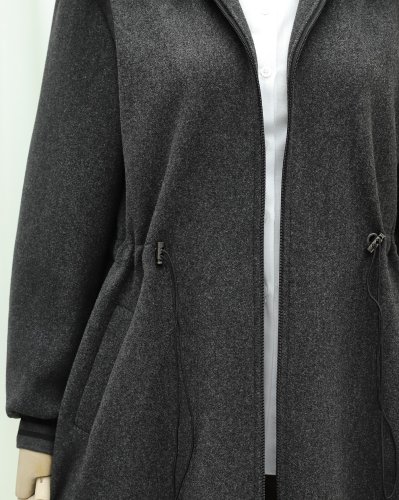 Kapşonlu Beli Lastikli Cepli Kaşe Kaban -Antrasit