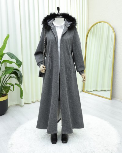 Kapşonlu Beli Lastikli Cepli Kaşe Kaban -Füme