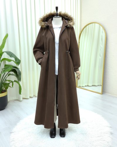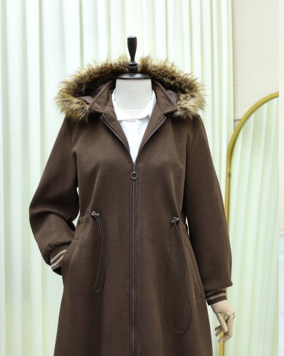 Kapşonlu Beli Lastikli Cepli Kaşe Kaban -Kahve