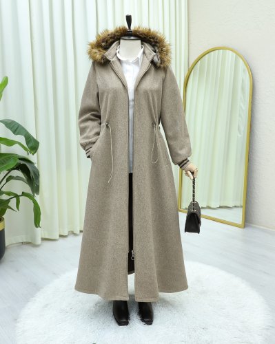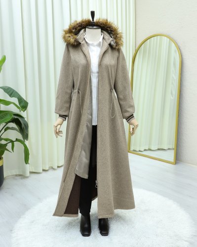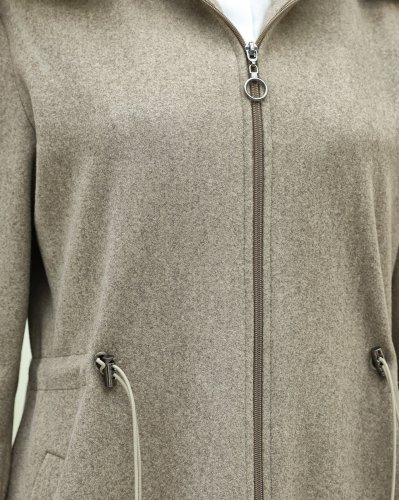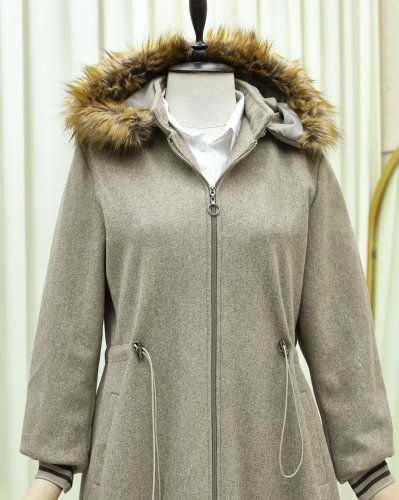 Kapşonlu Beli Lastikli Cepli Kaşe Kaban -Taş