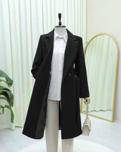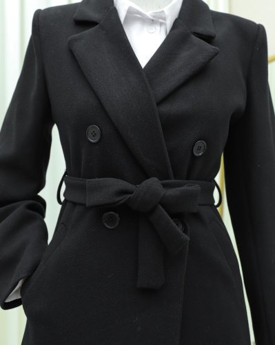 Tek Düğmeli Cepli Kemerli Astarlı Kaşe Kaban -Siyah