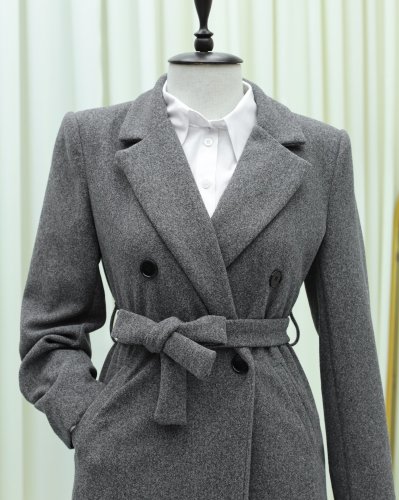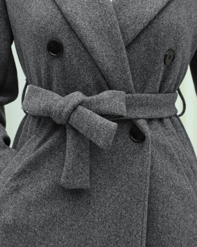 Tek Düğmeli Cepli Kemerli Astarlı Kaşe Kaban -Füme