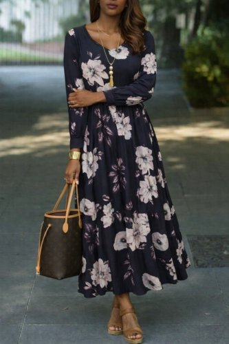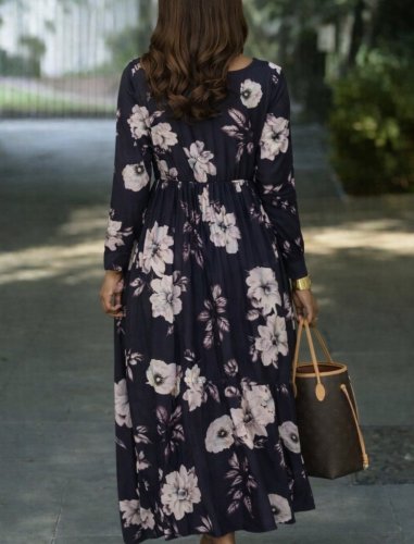 Kadın uzun kollu v yakalı çiçek desenli maxi süprem elbise