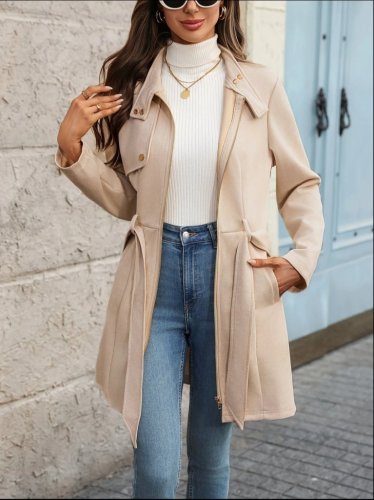 Kadın uzun kollu boyundan düğmeli fermuarlı beli kuşaklı süet ceket