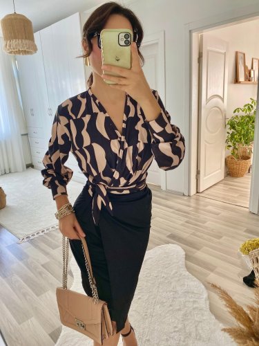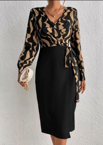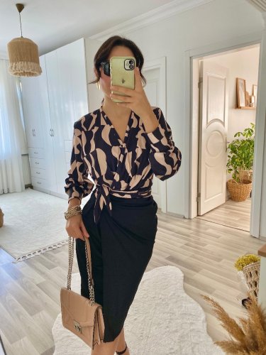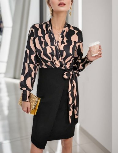 Kadın uzun kollu kruvaze yaka dijital baskılı fiyonk detay atlas kumaş elbise