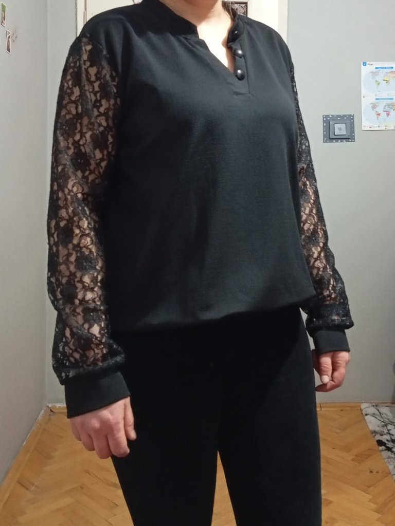 Kadın uzun kollu yaka düğme detay güpürlü kol krep bluz