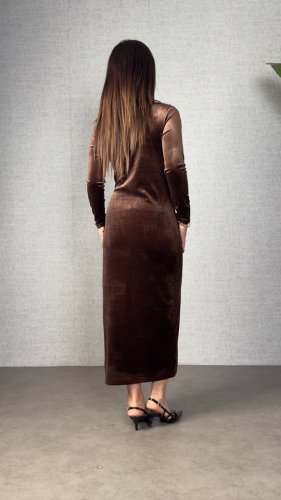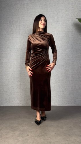 Kadınbalıkçı yaka büzgü ve taş işleme detay Maxi boy kadife elbise