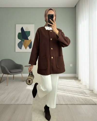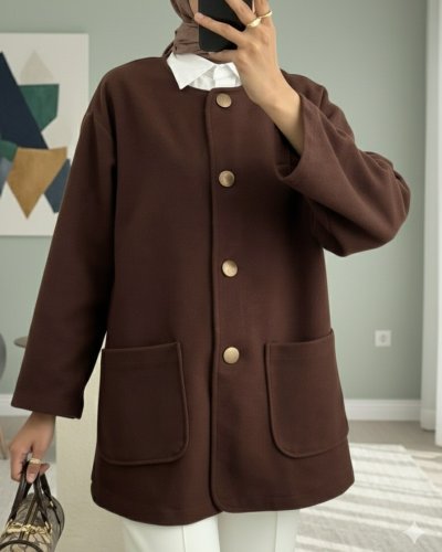 Çift Cepli Önü Düğmeli Kaşe Ceket -Kahve