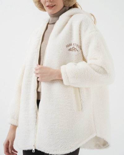 Kapşonlu Fermuarlı Kanguru Cepli Peluş Mont -Ekru